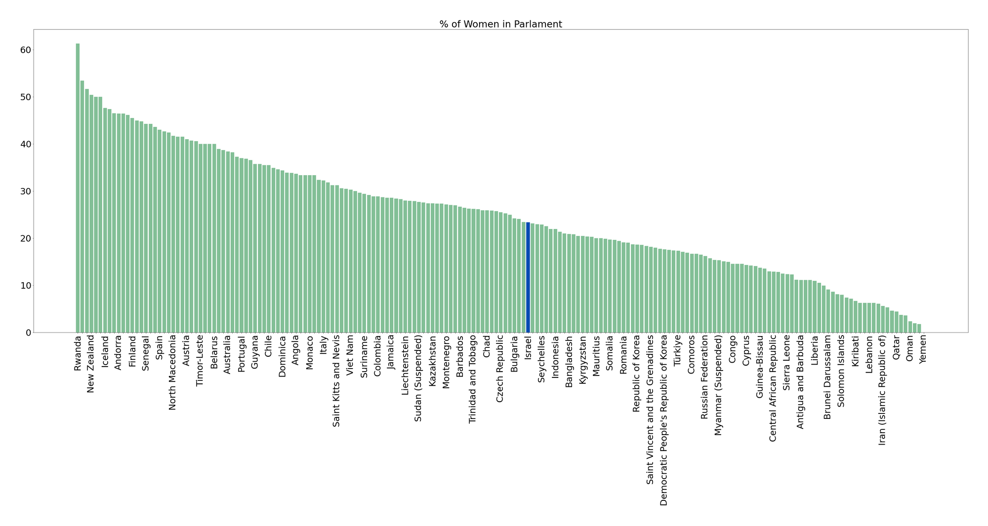 בהשוואה למדינות ה-oecd, ישראל נמצאת במקום נמוך אפילו יותר כשמבקום הראשון ניו-זילנד עם 50% נשים בפרלמנט (וראש ממשלה אישה - ג׳סינדה ארדרן).