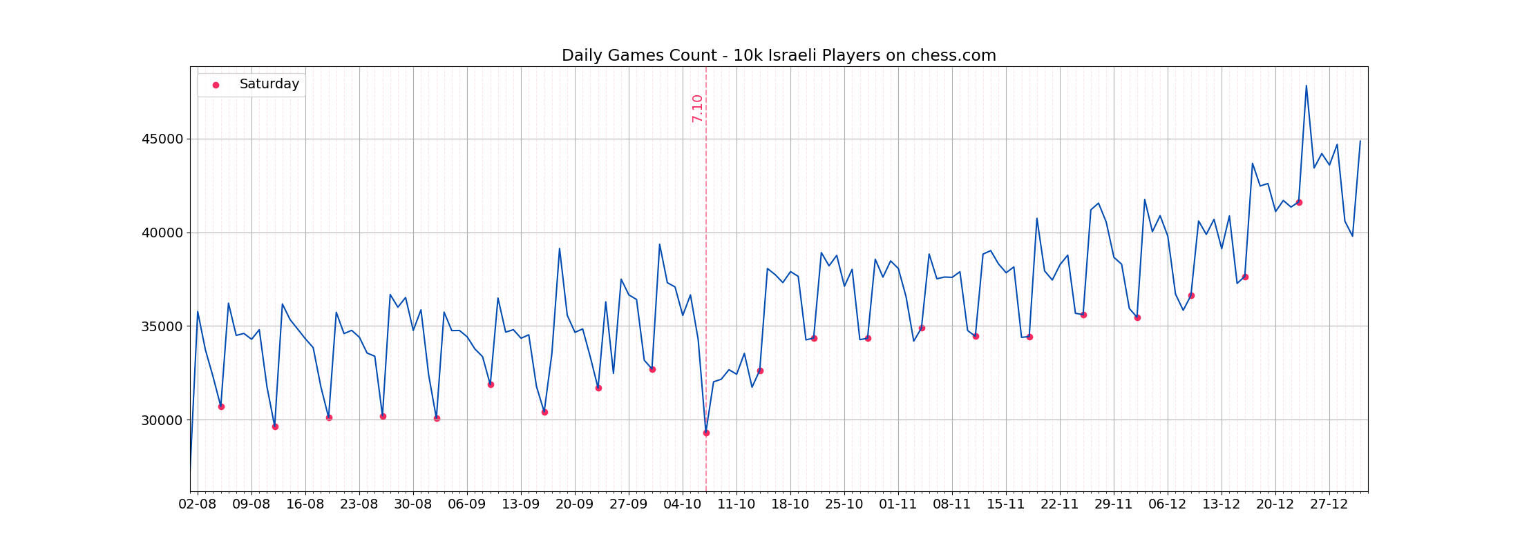 יותר שחמט באינטרנט, יותר שחמט ביום שבת - בשבוע שלאחר ה7.10, ישראלים שיחקו פחות מהממוצע וכנראה הראש היה טרוד בהתמודדות עם האסון. אחרי השבוע הראשון, ישראלים משחקים יותר מבעבר. מגמה שהולכת וגוברת ומגיעה לעליה של כ-15% בכמות המשחקים היומית.
