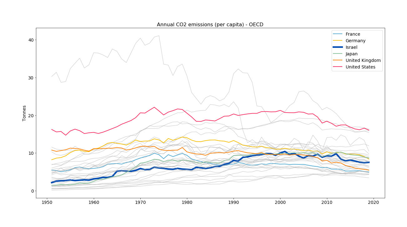 ראש הממשלה נפתלי בנט הציג את התכניות של ישראל להגיע לאפס פליטות גזי חממה עד שנת 2050. אפשר לראות פה עד כמה קשה להוריד את כמות הפליטת אפילו קצת לאורך זמן.