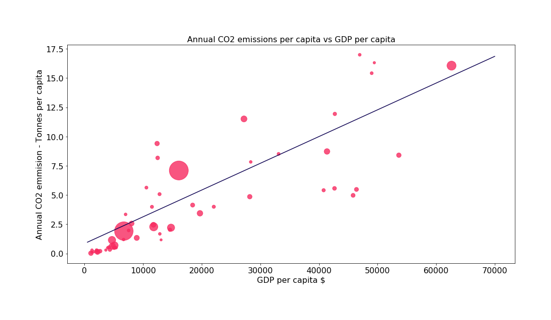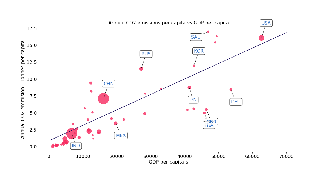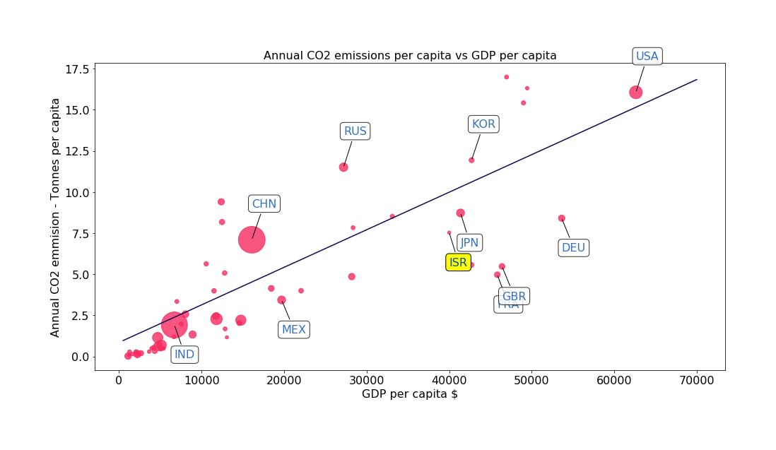 בגרף פה, אפשר לראות באופן די מובהק את מה שדי ידוע - ככל שמדינה עשירה יותר, היא מזהמת יותר את האויר. פלוס מינוס. יש קצת יוצאי דופן, אבל בגדול יש קשר כמעט ישר בין תמג לנפש לבין פליטת פחמן לאטמוספירה לנפש בחלוקה לפי מדינה.