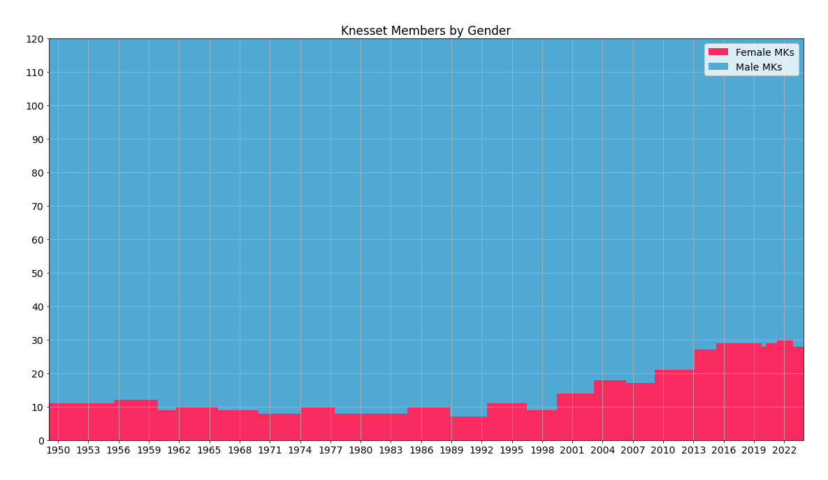 עלייה בייצוג הנשים בכנסת שהתחילה ב-1999 נעצרה והמספר די קבוע בעשור האחרון - קצת פחות מ-30 חברות כנסת, כרבע ממספר חברי הבית. בבחירות האחרונות נכנסו לכנסת 29 נשים, אחת פחות מהכנסת שלפני (במועד ההשבעה).