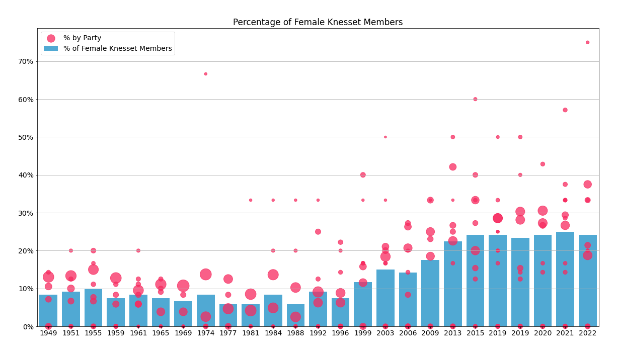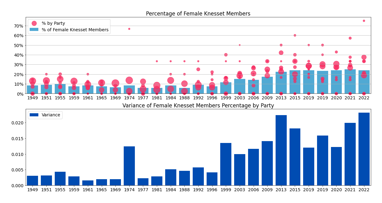 ואכן - פה בגרף התחתון, רואים שהשונות הסטטיסטית בין המפלגות בכנסת זאת, בייצוג הנשים היא הגדולה מאז קום המדינה (מעט יותר מהכנסת ה-19 שהושבעה ב-2013). נתון מעניין שאולי אומר משהו על הקיטוב הפוליטי שגדל.